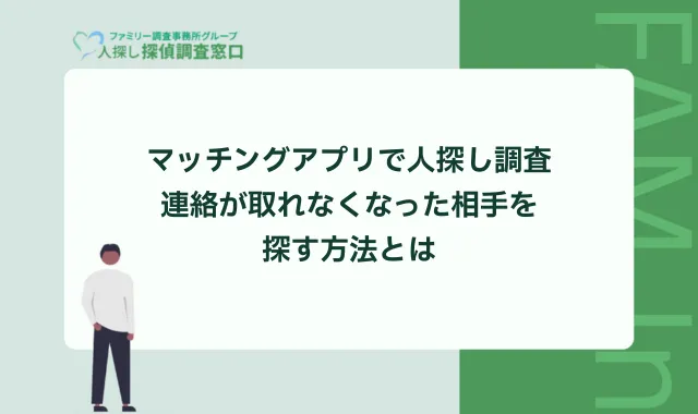 マッチングアプリを使った人探しには、根気と労力を伴います。自分一人で解決が難しいとお考えの場合は、人探しの専門家に相談するのも一つの方法です。